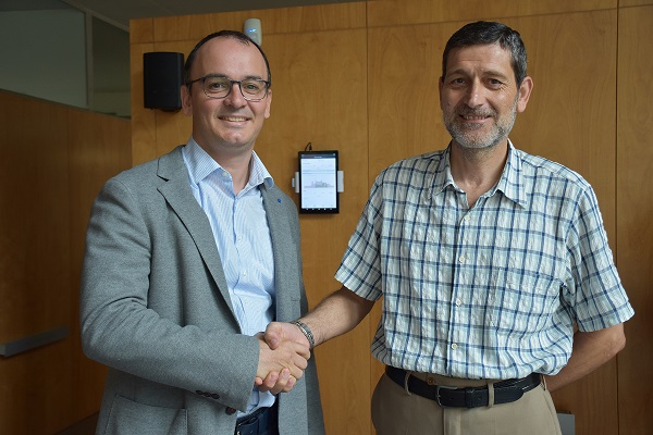 El director entrant, Pere Quintana Seguí (a l'esquerra), donant la mà al director sortint, David Altadill Felip.