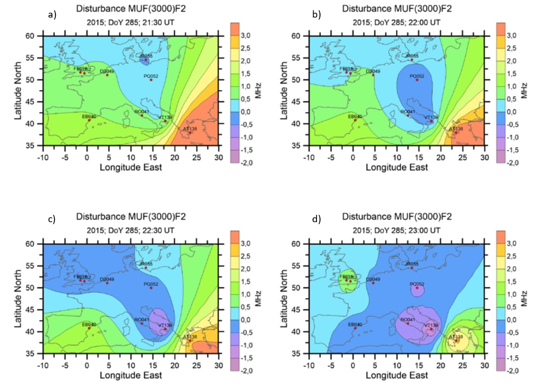 Evolució de la pertorbació observada a la Freqüència Màxima Utilitzable a 3000km (MUF(3000)F2) causada pel pas d’una TID sobre Europa a (a) 21:30 UT; (B) 22:00 UT; (C) 22:30 UT; (d) 23:00 UT del 12 d'octubre de 2015. Cada instantània s'obté mitjançant la interpolació de Kringing de la variació de MUF(3000)F2 registrats a cadascuna de les estacions indicades. En els mapes s’aprecia la propagació NW-SE de la pertorbació.