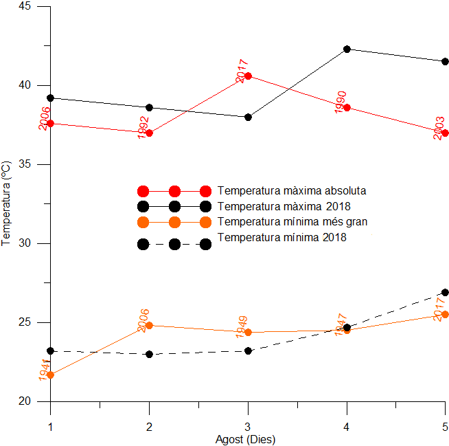 L’onada de calor que ens està afectant durant aquests dies deixa, a l’Observatori de l’Ebre, uns quants rècords de temperatura. Així, el dia 4 la temperatura màxima va ser de 42.3 ºC que és el valor més alt mai enregistrat durant un més d’agost i és alhora el segon valor més alt de tota la sèrie històrica després dels 43ºC enregistrats el 7 de juliol de 1982. La mínima del dia 5 també és de rècord, ja que els 26.9 ºC són el valor més alt per una temperatura mínima de tota la sèrie.